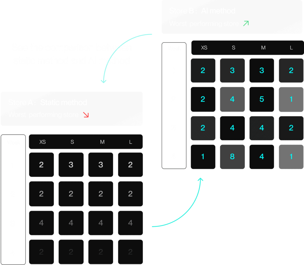 Predicting SKU needs up to 14 days ahead, it minimizes overstock and eliminates understock, integrating seamlessly with existing software for easy management and adjustment of stock levels. The AI Replenisher’s deep learning model uncovers patterns across various factors like seasonality and weather, optimizing stock levels to match demand.